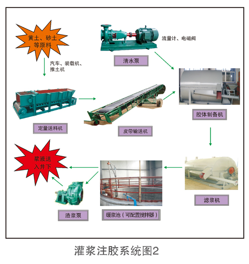 灌漿系統由漿料儲存場地、定量送料機、皮帶輸送機等漿料定量、計量、輸送系統、連續式定量灌漿系統、地面懸浮劑添加系統、過濾攪拌系統、輸漿管網系統和井下懸浮劑添加系統構成。
